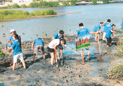 志愿者在三亚种植红树林。 资料图片