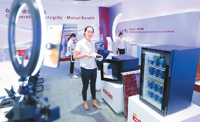 6月15日,为期10天的第127届广交会在网上开幕,这是中国首次完全以网络形式举办的广交会。广交会按16大类商品设置50个展区,全部免收参展费用,帮助企业减负纾困,开拓国际市场。图为6月15日,位于山东省青岛市的青岛营上电器有限公司,营销人员通过广交会直播平台推介出口到非洲等海外市场的冰箱产品。 梁孝鹏摄(人民视觉)