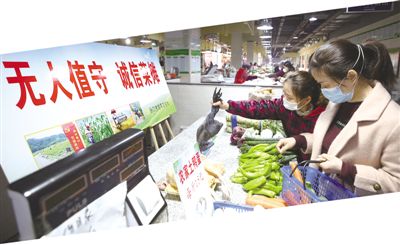 居民在“无人值守诚信菜摊”自助采购蔬菜。 唐家凯摄(人民视觉)