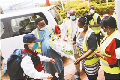 四月十六日,在布基纳法索首都瓦加杜古,布方代表欢迎中国政府派遣的抗疫医疗专家组专家。 (新华社发)