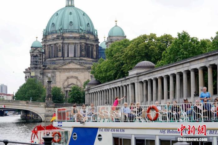 资料图:6月12日下午,一艘游船上的游客以柏林大教堂为背景自拍。 中新社记者 彭大伟 摄