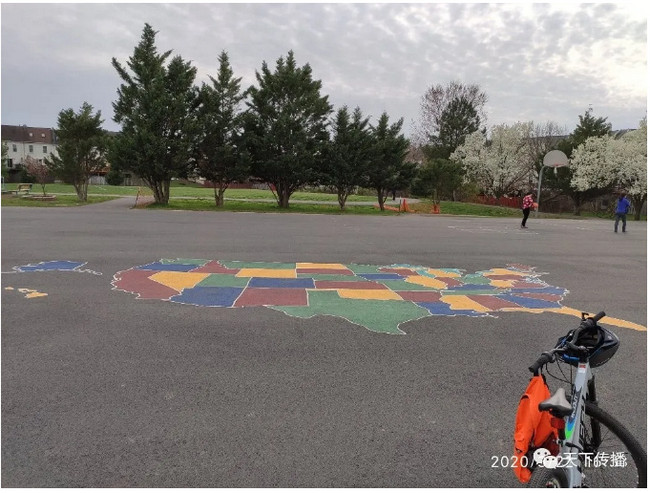 美国的爱国主义不只宣誓,学校、教室到处挂着国旗、国徽(中国只有为人民服务的地方才挂),操场上还印着地图。
