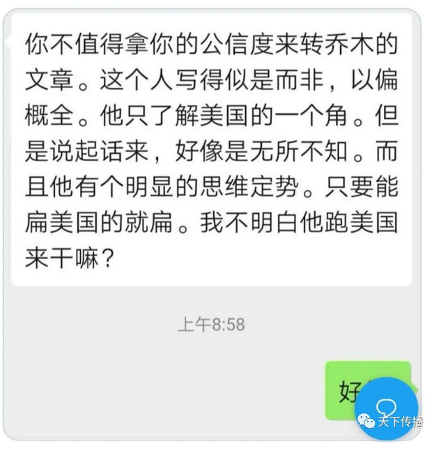 这个公号天下传播(tianxiaus),系统没有给留言功能。目前我有个微博“乔木DC”、推特 @qiaomoo 可以评论,我会查看互动。