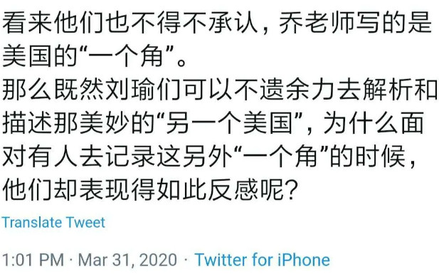 你朋友说得对。任何人的写作都是选择性的,我和你朋友说的都是事实,但都是部分事实,各方面都看,就完整了。就是因为你朋友、刘瑜、林达等只说了美国的一面,我才说另一面。哪怕是他说的“只了解美国一个角”,也是真实存在。