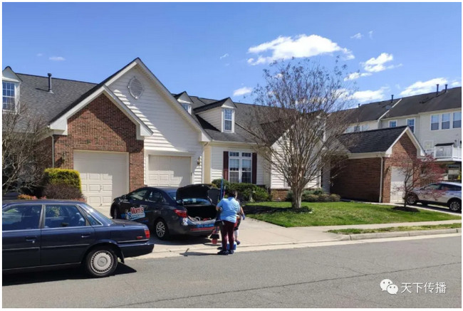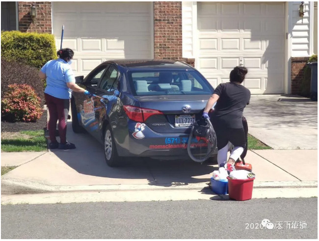 中午散步,社区里看到一对美国母女,疫情如此紧张,仍然拿着各种清洁用具,上门为人服务。她们的车上,写着Mom’s Cleaning Service (妈妈保洁服务)和电话号码。