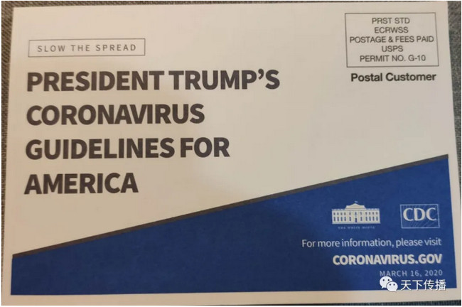 这不,今天花纳税人邮资已付的钱,寄来了明信片,以白宫和CDC(疾控中心)的名义,大写着“川普总统为美国抗击冠状病毒的指导方针”。