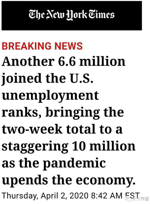 比疫情更可怕的是失业。我昨天的日记提到美国失业300多万人,是上周的数字。这周又增加了660万,达到了1千万。