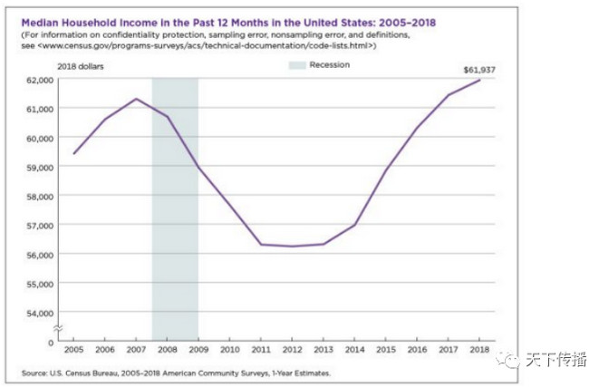 美国的收入,政府的统计,2005到2018,家庭年收入的税前中位数在56000—61000之间波动。取6万,每个月就是5千,夫妻每人2500美元,也就是说。我在机场工作的邻居Will,每月可能就挣这么多,或再多一点。