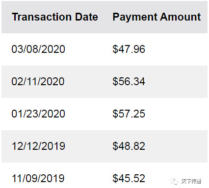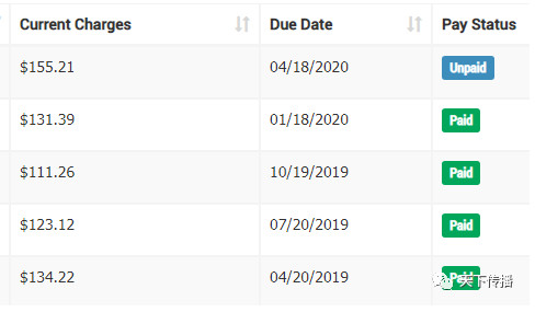 这是我家的水费,三个月一付,平均每个月45美元。最新的一个季度,由于疫情,在家较多,水费是155美元,4月18日以前交。还没付(Unpaid)。
