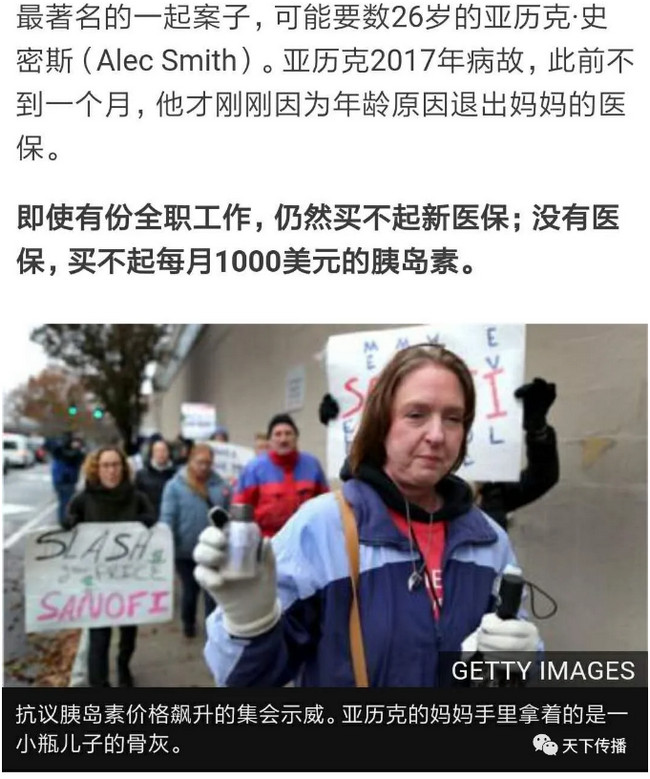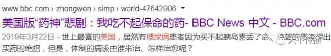 对于美国高发的糖尿病患者,就更要命了。救命不可少的胰岛素,由于几家医药公司的垄断,价格高昂,很多人买不起(近3000万人没有医保),有人死了,多数人想办法到邻国加拿大或墨西哥买。