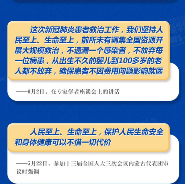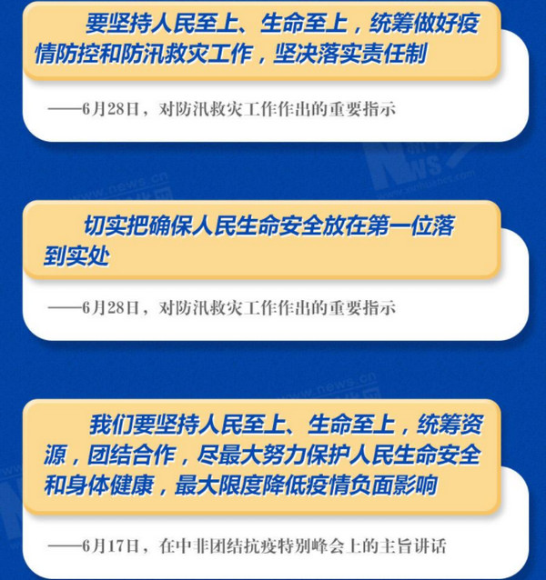 新冠肺炎疫情发生以来,习近平在不同场合强调“人民至上、生命至上”的原则,要求尽最大努力防止更多群众被感染,尽最大可能挽救更多患者生命。面对汛情,习近平最为关切的还是人民安危,最为牵挂的是受灾群众。