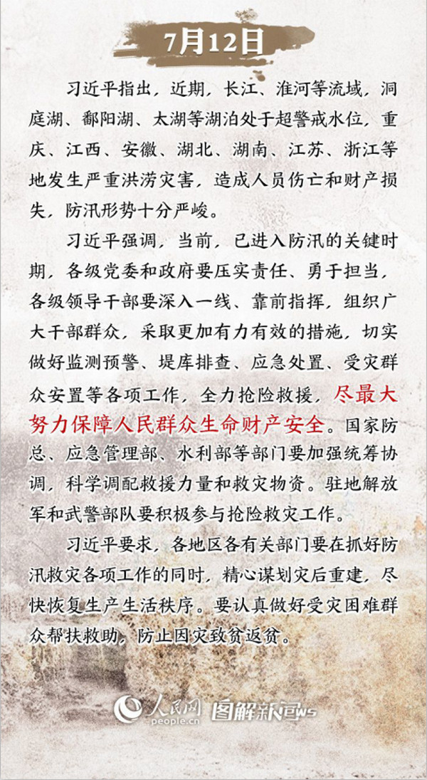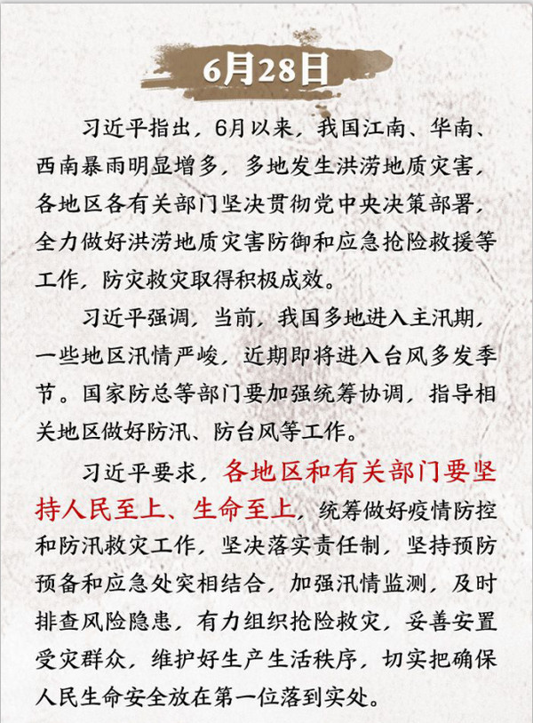 面对严峻的防汛形势,习近平总书记高度重视,于6月28日和7月12日先后两次对防汛救灾工作作出重要指示。“人民至上、生命至上”,习近平要求各部门坚持把确保人民群众生命财产安全放在首位,落实责任,狠抓隐患排查,强化应急预案,进一步加强监测预警、联防联动,为当前防汛抢险救灾工作指明了方向。