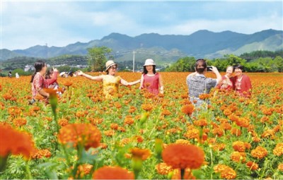 游客在江西省龙南县万寿菊“花海”赏花。 廖翠霞摄(人民视觉)