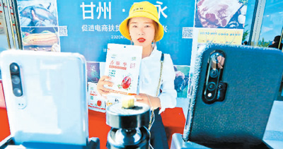在甘肃张掖甘州区明永镇的田间地头,主播正向消费者推广特产“金丝小枣脆枣片”。 王 将摄(人民图片)