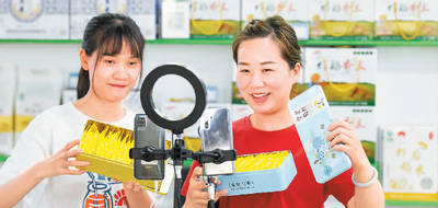 7月13日,在河北省邯郸市永年区工业园区冀南电商产业园,主播利用直播平台销售服装。 胡高雷摄(人民图片)