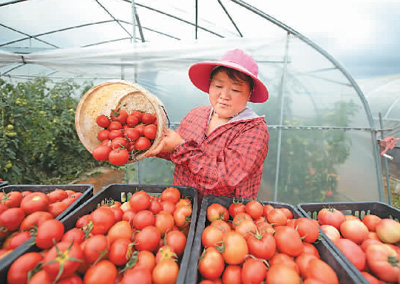 近年来,贵州省毕节市黔西县莲城街道办事处鼓励和引导村民发展蔬菜种植,提高土地种植效益,帮助村民增收致富。图为村民在采摘西红柿。 罗兴祥摄(人民视觉)