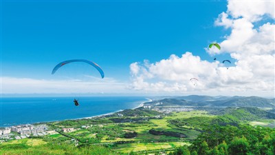 在海南陵水,游客体验滑翔伞运动,从空中俯瞰海岛美景。 李 民摄(人民视觉)
