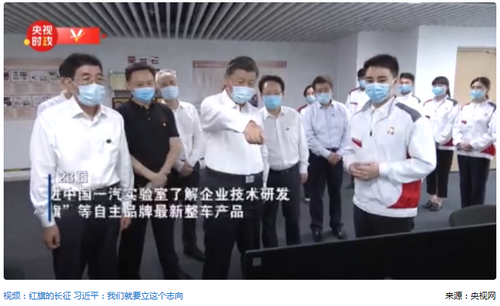 2020年7月23日下午,正在吉林考察的习近平总书记来到中国一汽集团研发总院,走进实验室了解企业技术研发情况,并察看了“红旗”等自主品牌的最新款式整车产品。习近平鼓励一汽人,要把关键技术、核心技术掌握在自己手里,“我们就要立这个志向,一定要把我们的民族品牌搞上去。”