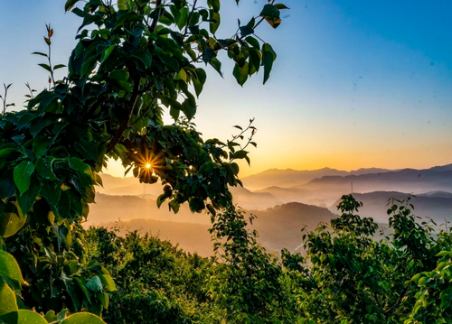 山顶松柏苍翠、绿竹成荫、鸟语花香戴起了绿色的帽子,山腰果树成行、百花盛开、硕果累累鼓起了乡亲们的钱袋子,山脚湖光山色、流水潺潺、稻花飘香装满了乡亲们的米缸子。